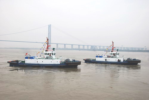 2013年10月29日下午,由江蘇省鎮江船廠(chǎng)(集團)有限公司為唐山港曹妃甸拖船有限公司建造的兩艘全回轉拖船——“曹港19”、“曹港20”,在鎮江船廠(chǎng)完工出廠(chǎng),順利啟航。唐山曹妃甸實(shí)業(yè)港務(wù)有限公司孫紅總經(jīng)理、唐山港曹妃甸拖船有限公司侯守柱總經(jīng)理等領(lǐng)導和來(lái)賓專(zhuān)程赴鎮江船廠(chǎng)參加了開(kāi)航儀式。 |